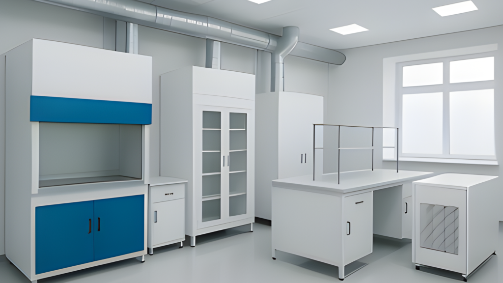 Produksi furniture laboratorium custom yang aman, ergonomis, dan sesuai standar, termasuk Wall Bench, Island Bench, Work Bench dan lemari bahan kimia.